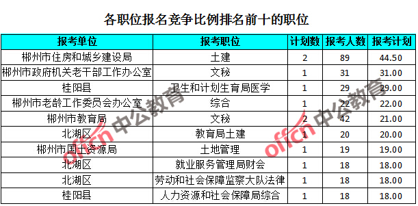 競(jìng)爭(zhēng)熱門(mén)職位,前三位依次是:郴州市住房和城鄉(xiāng)建設(shè)局土建(競(jìng)爭(zhēng)比例44.5:1)、郴州市政府機(jī)關(guān)老干部工作辦公室文秘(競(jìng)爭(zhēng)比例31:1)和桂陽(yáng)縣衛(wèi)生和計(jì)劃生育局醫(yī)學(xué)(競(jìng)爭(zhēng)比例29:1)。
