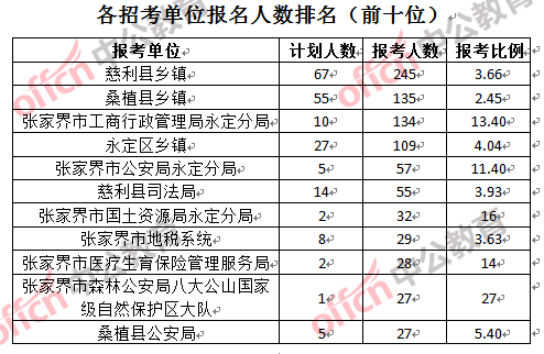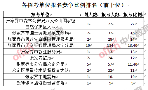 競爭熱門招考單位,前三位依次是:張家界市森林公安局八大公山自然保護區(qū)大隊(競爭比例27:1)、張家界市國土資源局永定分局(競爭比例16:1)和張家界市醫(yī)療生育保險管理服務(wù)局(競爭比例14:1)。
