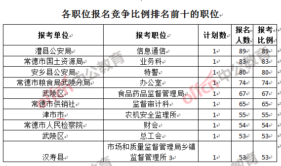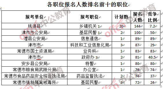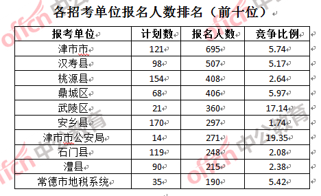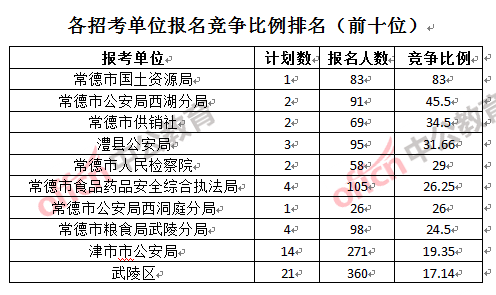 競(jìng)爭(zhēng)熱門招考單位,前三位依次是:常德市國(guó)土資源局(競(jìng)爭(zhēng)比例83:1)、常德市公安局西湖分局(競(jìng)爭(zhēng)比例45.5:1)和常德市供銷社(競(jìng)爭(zhēng)比例34.5:1)。