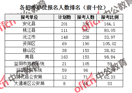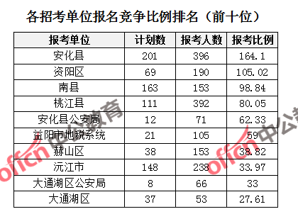 競(jìng)爭(zhēng)熱門(mén)招考單位,前三位依次是:安化縣(競(jìng)爭(zhēng)比例164.1:1)、資陽(yáng)區(qū)(競(jìng)爭(zhēng)比例105.02:1)、南縣(競(jìng)爭(zhēng)比例98.84:1)。