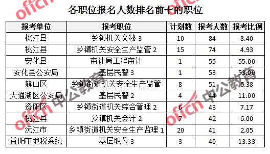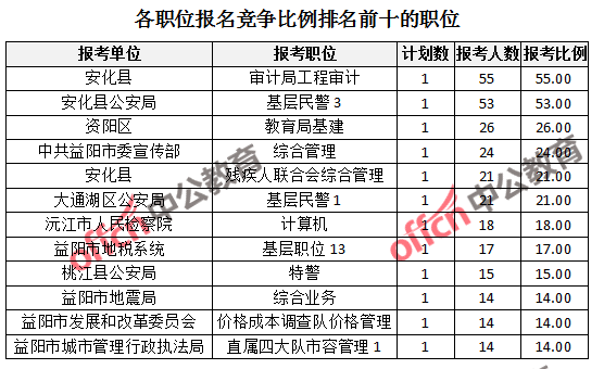 競(jìng)爭(zhēng)熱門(mén)職位,前三位依次是:安化縣審計(jì)局工程審計(jì)(競(jìng)爭(zhēng)比例55:1)、安化縣公安局基層民警3(競(jìng)爭(zhēng)比例53:1)、資陽(yáng)區(qū)教育局基建(競(jìng)爭(zhēng)比例26:1)。