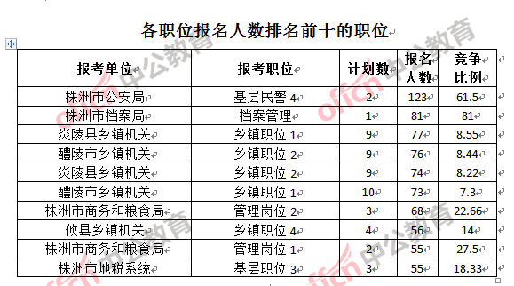 為幫助廣大考生更清晰的了解報(bào)名情況,中公教育整理了株洲市各職位的報(bào)名人數(shù)排名以及競爭比例排名,供廣大考生參考: