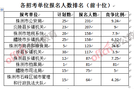 競爭熱門招考單位,前三位依次是:株洲市檔案局(競爭比例81:1)、株洲市國土資源局荷塘分局和株洲市天元區(qū)嵩山路街道辦事處(競爭比例29:1)。