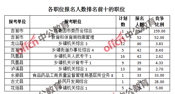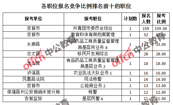 競爭熱門職位,前三位依次是:吉首市共青團市委員會綜合(競爭比例159:1)、吉首市教育和體育局檔案管理(競爭比例52:1)和永順縣食品藥品工商質量監(jiān)督管理局基層所業(yè)務8(競爭比例33:1)。