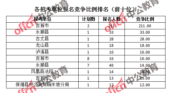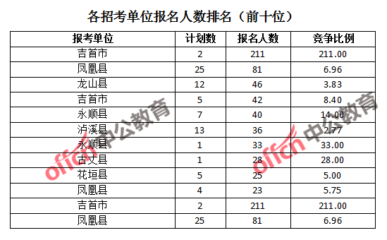 競爭熱門招考單位,前三位依次是:吉首市(競爭比例211:1)、永順縣(競爭比例33:1)和古丈縣(競爭比例28:1)。