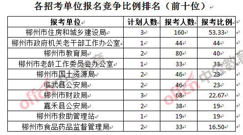 競爭熱門招考單位,前三位依次是:郴州市住房和城鄉(xiāng)建設(shè)局(競爭比例53.33:1)、郴州市政府機關(guān)老干部工作辦公室(競爭比例44:1)和郴州市教育局(競爭比例40:1)。