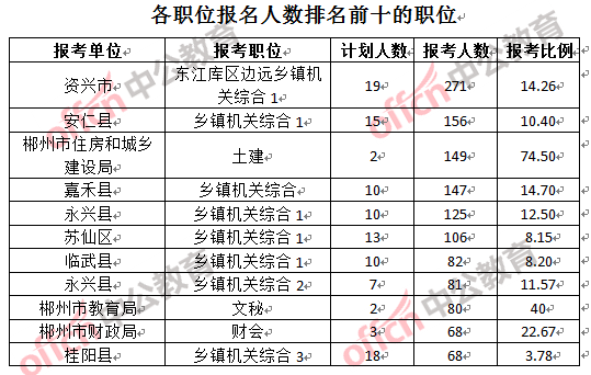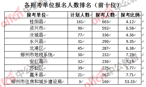為幫助廣大考生更清晰的了解報名情況,中公教育整理了郴州市各招考單位的報名人數(shù)排名以及競爭比例排名,供廣大考生參考: