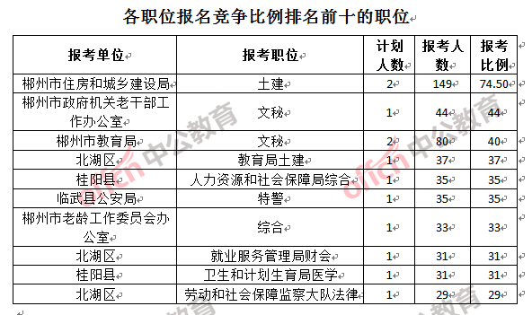 為幫助廣大考生更清晰的了解報名情況,中公教育整理了郴州市各職位的報名人數(shù)排名以及競爭比例排名,供廣大考生參考: