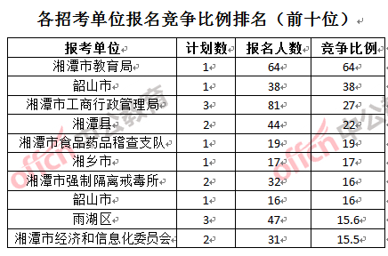 競爭熱門招考單位,前三位依次是:湘潭市教育局(競爭比例64:1)、韶山市(競爭比例38:1)和湘潭市工商行政管理局(競爭比例27:1)。