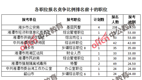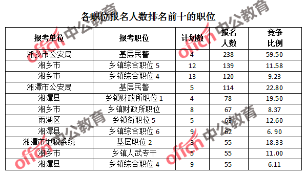 競爭熱門職位,前三位依次是:湘鄉(xiāng)市公安局基層民警(競爭比例59.5:1)、湘潭市經(jīng)濟和信息化委員會綜合管理職位(競爭比例53:1)和湘潭市供銷合作總社綜合崗位1(競爭比例53:1)。