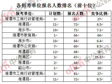 為幫助廣大考生更清晰的了解報名情況,中公教育整理了湘潭市各招考單位的報名人數(shù)排名以及競爭比例排名,供廣大考生參考: