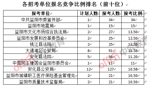 競爭熱門招考單位,前三位依次是:中共益陽市委宣傳部(競爭比例34:1)、益陽市地震局(競爭比例15:1)和益陽市文化市場綜合執(zhí)法局(競爭比例13.5:1)。