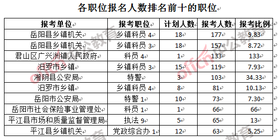 截止25日17時(shí),2017年岳陽(yáng)公務(wù)員報(bào)名人數(shù)最多的前三個(gè)職位為岳陽(yáng)縣鄉(xiāng)鎮(zhèn)機(jī)關(guān)鄉(xiāng)鎮(zhèn)科員4(177人報(bào)名)、岳陽(yáng)縣鄉(xiāng)鎮(zhèn)機(jī)關(guān)鄉(xiāng)鎮(zhèn)科員3(157人報(bào)名)和君山區(qū)廣興洲鎮(zhèn)人民政府科員4(133人報(bào)名)。