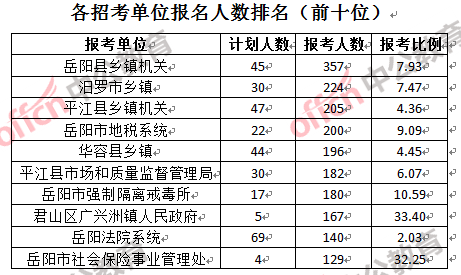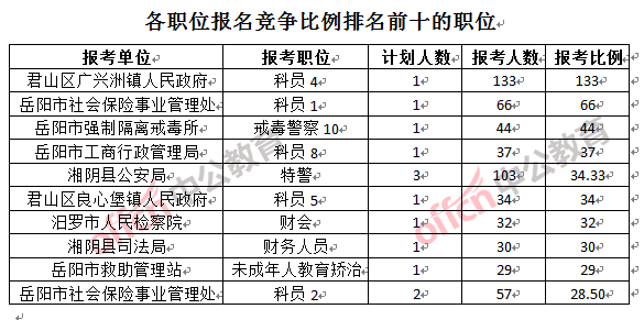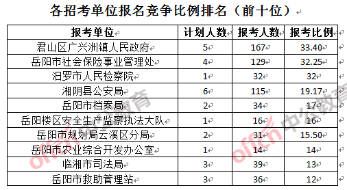 競(jìng)爭(zhēng)熱門招考單位,前三位依次是:君山區(qū)廣興洲鎮(zhèn)人民政府(競(jìng)爭(zhēng)比例33.4:1)、岳陽(yáng)市社會(huì)保險(xiǎn)事業(yè)管理處(競(jìng)爭(zhēng)比例32.25:1)和汨羅市人民檢察院(競(jìng)爭(zhēng)比例32:1)。