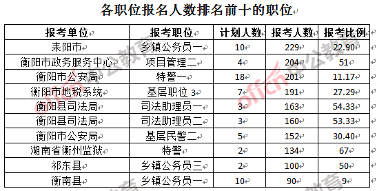 為幫助廣大考生更清晰的了解報名情況,中公教育整理了衡陽市各職位的報名人數(shù)排名以及競爭比例排名,供廣大考生參考: