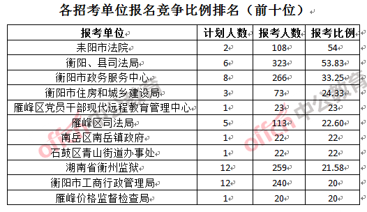 競爭熱門招考單位,前三位依次是:耒陽市法院(競爭比例54:1)、衡陽縣司法局(競爭比例53.83:1)和衡陽市政務(wù)服務(wù)中心(競爭比例33.25:1)。