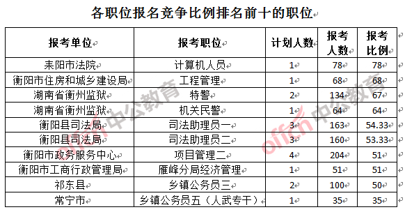 競爭最熱門職位,前三依次是:耒陽市法院計算機(jī)人員(競爭比例78:1)、衡陽市住房和城鄉(xiāng)建設(shè)局工程管理(競爭比例68:1)和湖南省衡州監(jiān)獄特警(競爭比例67:1)。