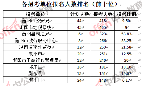 為幫助廣大考生更清晰的了解報名情況,中公教育整理了衡陽市各招考單位的報名人數(shù)排名以及競爭比例排名,供廣大考生參考: