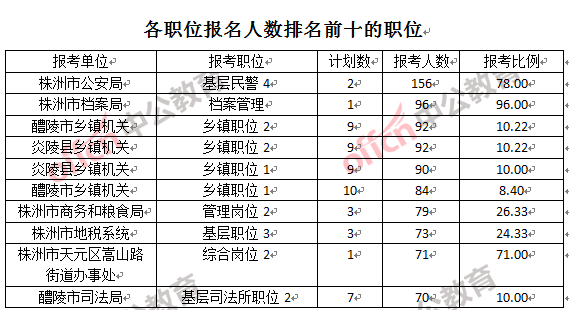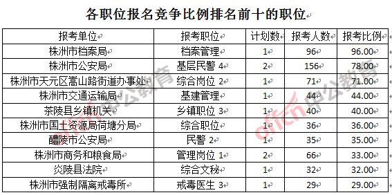 競爭熱門職位,前三位依次是:株洲市檔案局檔案管理(競爭比例96:1)、株洲市公安局基層民警4(競爭比例78:1)、株洲市天元區(qū)嵩山路街道辦事處綜合崗位2(競爭比例71:1)。