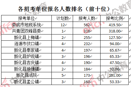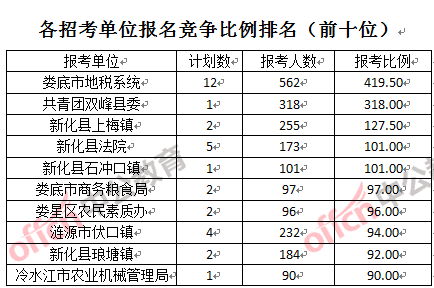 競(jìng)爭(zhēng)熱門招考單位,前三位依次是:婁底市地稅系統(tǒng) (競(jìng)爭(zhēng)比例419:1)、共青團(tuán)雙峰縣委(競(jìng)爭(zhēng)比例318:1)和新化縣上梅鎮(zhèn)(競(jìng)爭(zhēng)比例127:1)。