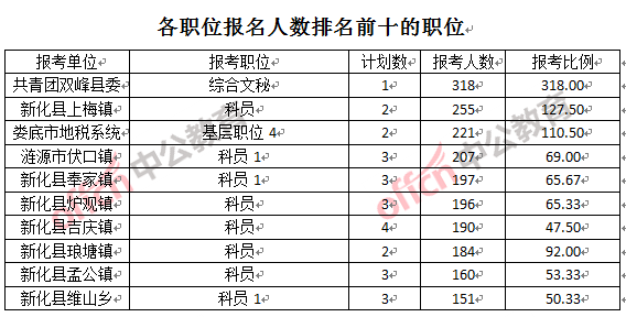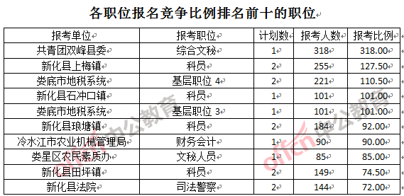 競(jìng)爭(zhēng)熱門職位,前三位依次是:共青團(tuán)雙峰縣委綜合文秘(競(jìng)爭(zhēng)比例318:1)、新化縣上梅鎮(zhèn)科員(競(jìng)爭(zhēng)比例127:1)、婁底市地稅系統(tǒng)基層職位4(競(jìng)爭(zhēng)比例110:1)
