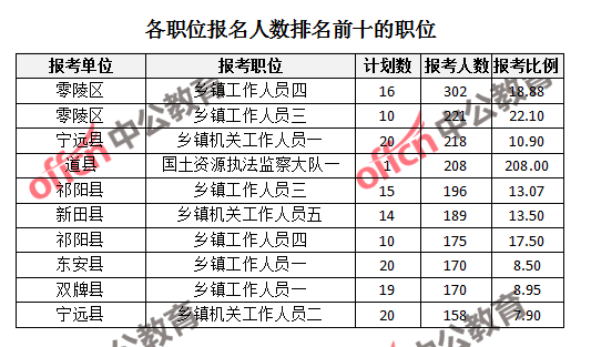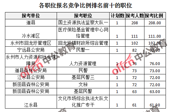 為幫助廣大考生更清晰的了解報名情況,中公網(wǎng)校整理了永州市各職位的報名人數(shù)排名以及競爭比例排名,供廣大考生參考: