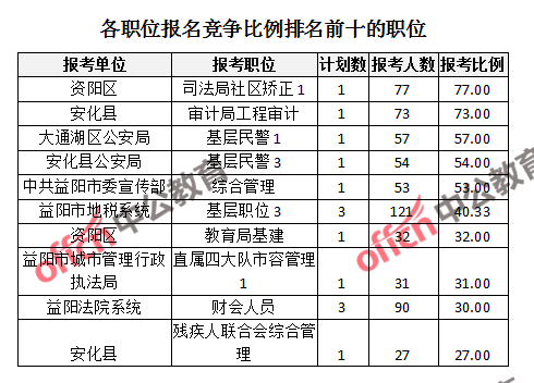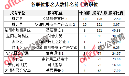 競(jìng)爭(zhēng)熱門職位,前三位依次是:資陽區(qū)司法局社區(qū)矯正1(競(jìng)爭(zhēng)比例77:1)、安化縣審計(jì)局工程審計(jì)(競(jìng)爭(zhēng)比例73:1)、大通湖區(qū)公安局基層民警1(競(jìng)爭(zhēng)比例57:1)。
