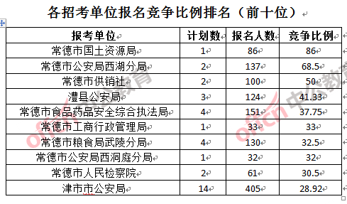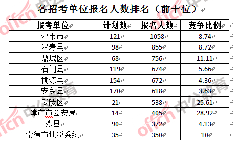為幫助廣大考生更清晰的了解報名情況,中公網(wǎng)校整理了常德市各招考單位的報名人數(shù)排名以及競爭比例排名,供廣大考生參考: