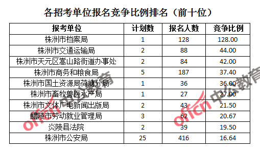 競爭熱門招考單位,前三位依次是:株洲市檔案局(競爭比例128:1)、株洲市交通運輸局(競爭比例44:1)和株洲市天元區(qū)嵩山路街道辦事處(競爭比例42:1)。