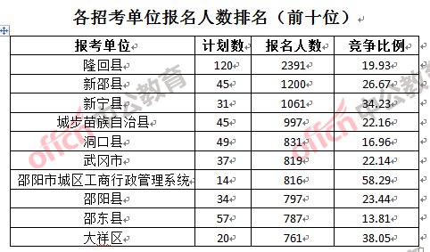 為幫助廣大考生更清晰的了解報(bào)名情況,中公網(wǎng)校整理了邵陽各招考單位的報(bào)名人數(shù)排名以及競爭比例排名,供廣大考生參考: