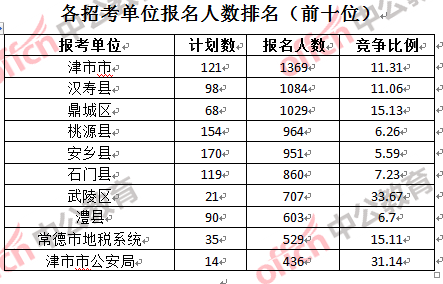為幫助廣大考生更清晰的了解報(bào)名情況,中公網(wǎng)校整理了常德市各招考單位的報(bào)名人數(shù)排名以及競(jìng)爭(zhēng)比例排名,供廣大考生參考: