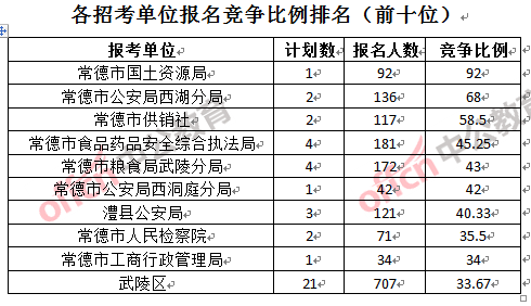 競(jìng)爭(zhēng)熱門招考單位,前三位依次是:常德市國(guó)土資源局(競(jìng)爭(zhēng)比例92:1)、常德市公安局西湖分局(競(jìng)爭(zhēng)比例68:1)和常德市供銷社(競(jìng)爭(zhēng)比例58.5:1)。