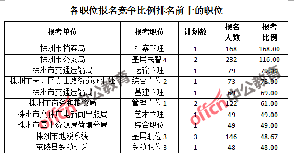 競爭熱門職位,前三位依次是:株洲市檔案局檔案管理(競爭比例168:1)、株洲市公安局基層民警4(競爭比例116:1)和株洲市交通運輸局運輸管理(競爭比例79:1)。