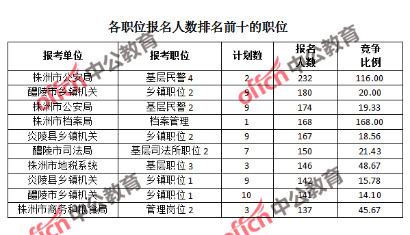 為幫助廣大考生更清晰的了解報名情況,中公網校整理了株洲市各職位的報名人數(shù)排名以及競爭比例排名,供廣大考生參考: