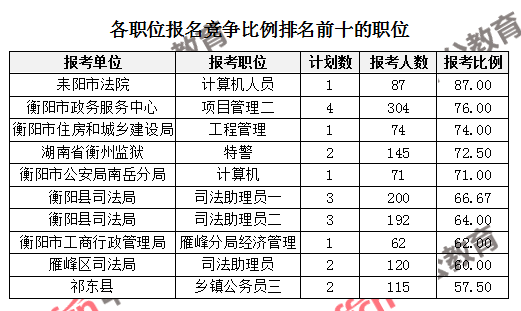 競爭熱門職位,前三位依次是:耒陽市法院計算機人員(競爭比例87:1)、衡陽市政務服務中心項目管理二(競爭比例76:1)、衡陽市住房和城鄉(xiāng)建設局工程管理(競爭比例74:1)。