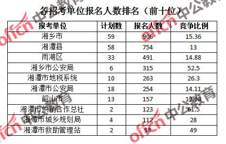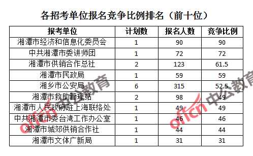 為幫助廣大考生更清晰的了解報(bào)名情況,中公網(wǎng)校整理了湘潭市各招考單位的報(bào)名人數(shù)排名以及競(jìng)爭(zhēng)比例排名,供廣大考生參考: