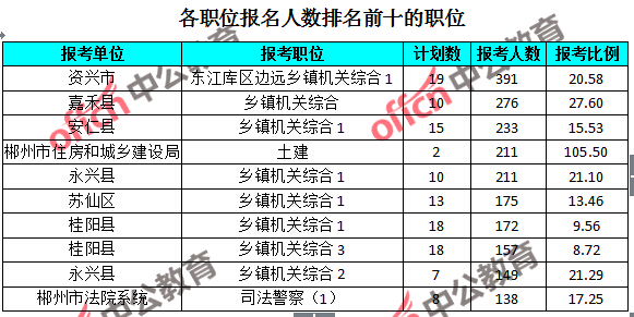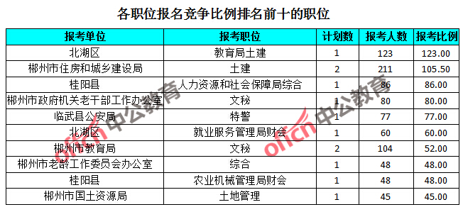 為幫助廣大考生更清晰的了解報(bào)名情況,中公網(wǎng)校整理了湖南郴州各職位的報(bào)名人數(shù)排名以及競(jìng)爭(zhēng)比例排名,供廣大考生參考: