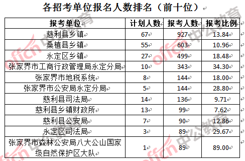 為幫助廣大考生更清晰的了解報(bào)名情況,中公網(wǎng)校整理了張家界市各招考單位的報(bào)名人數(shù)排名以及競爭比例排名,供廣大考生參考: