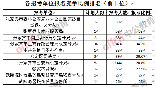 競爭熱門招考單位,前三位依次是:張家界市森林公安局八大公山自然保護(hù)區(qū)大隊(duì)(競爭比例89:1)、張家界市就業(yè)服務(wù)局(競爭比例53:1)和張家界市國土資源局永定分局(競爭比例44:1)。