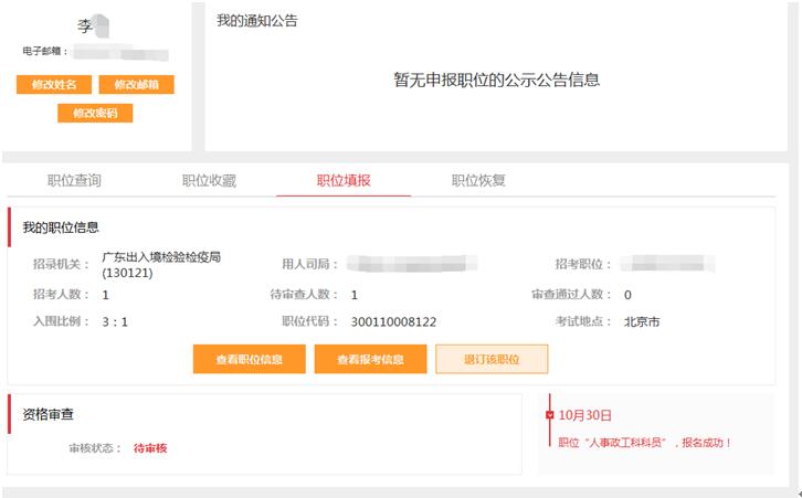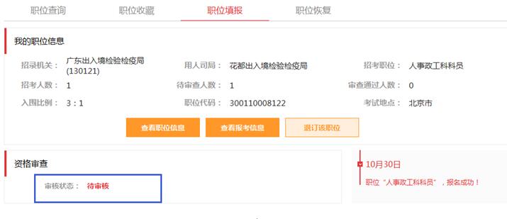 在報(bào)考完職位注意查看自己時(shí)候通過審核。報(bào)考人員請于2017年10月30日至11月10日期間登錄考錄專題網(wǎng)站查詢是否通過了資格審查。通過資格審查的,不能再報(bào)考其他職位。2017年10月30日8:00至11月8日18:00期間,報(bào)考申請尚未審查或未通過資格審查的,可以改報(bào)其他職位。2017年11月8日18:00至10日18:00期間,報(bào)考申請未審查或未通過資格審查的,不能再改報(bào)其他職位。