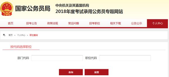 在選職位時(shí)首先需要輸入兩個(gè)代碼:部門(mén)代碼和職位代碼,考生要打開(kāi)職位表,選出自己能報(bào)考的職位,把兩個(gè)代碼填寫(xiě)完之后 點(diǎn)擊“查詢”,即可看到選報(bào)職位的詳細(xì)信息,如果輸入錯(cuò)誤需要重新輸入,那樣的話點(diǎn)擊“重置”,就可以重新選擇。