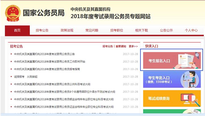首先打開中央機關(guān)及其直屬機構(gòu)2018考試錄用公務(wù)員專題信息網(wǎng)頁http://bm.scs.gov.cn/pp/gkweb/nps/apply/ui/business/home/gkhome.html?examkey=20180011