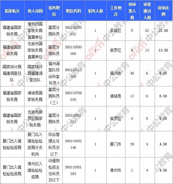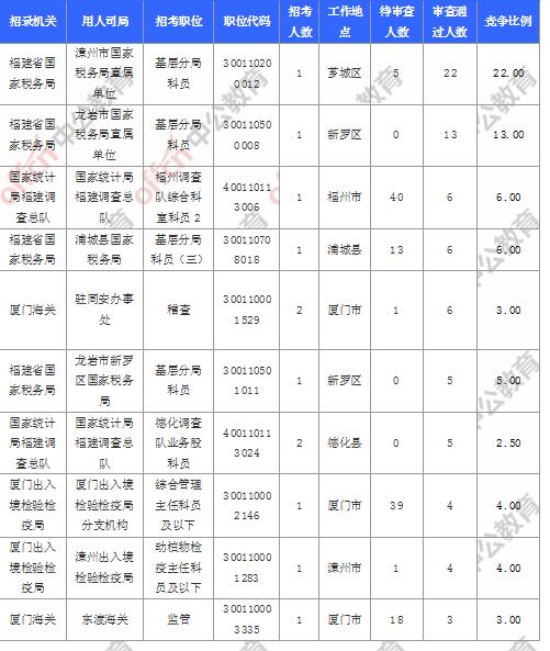 報(bào)名通過審核人數(shù)前十的職位主要集中在福建省國(guó)家稅務(wù)局、國(guó)家統(tǒng)計(jì)局福建調(diào)查總隊(duì)、廈門海關(guān)等部門,具體信息如下: