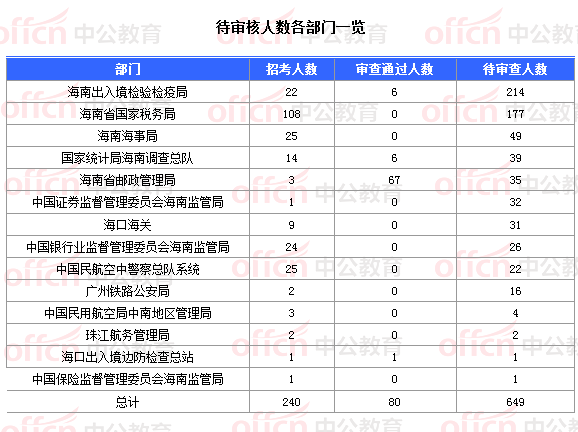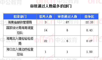 截止到30日18時(shí),通過審核人數(shù)前三位的部門依次是:海南省郵政管理局、國家統(tǒng)計(jì)局海南調(diào)查總隊(duì)、海南出入境檢驗(yàn)檢疫局,三部門通過審核總?cè)藬?shù)達(dá)79人,占通過審核總?cè)藬?shù)的98.75%。