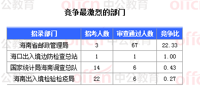 截至10月30日18時(shí),據(jù)中公網(wǎng)校統(tǒng)計(jì),國考職位中工作地點(diǎn)在海南的職位通過審核總?cè)藬?shù)為80人,共有158個(gè)職位無人通過審核,其中還有部分待審核的人數(shù)高達(dá)649人,平均競爭比例為0.33:1。