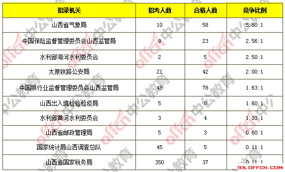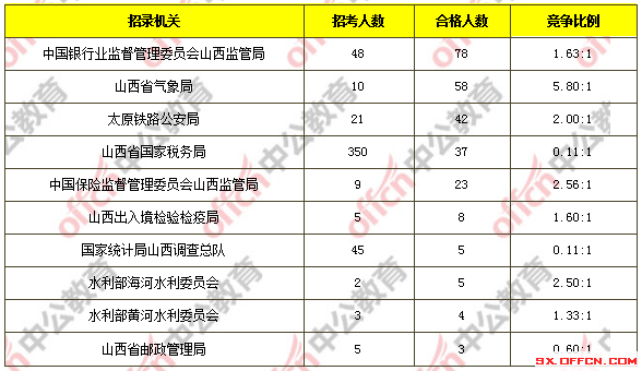 為幫助廣大考生更清晰的了解今日報(bào)名情況,山西中公教育整理了審核通過人數(shù)前十位的部門以及競爭比例最激烈的十大部門,供廣大考生參考: