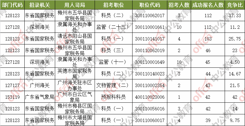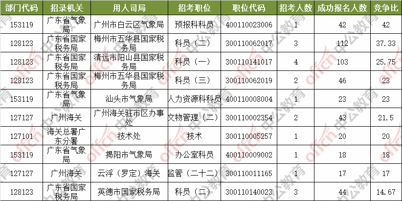 報名通過審核人數(shù)前十的職位主要集中在廣東省國家稅務局、深圳海關、廣東省國家稅務局等部門,具體信息如下: