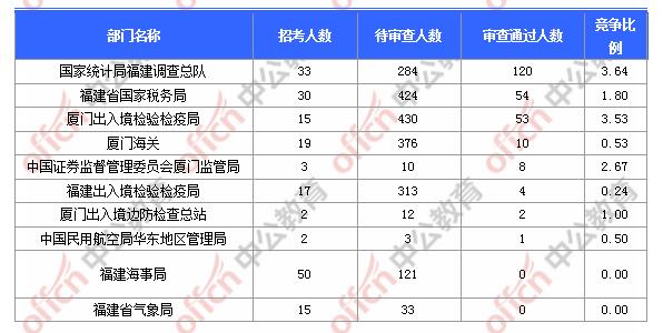 截止到31日9時,通過審核人數(shù)前三位的部門依次是:國家統(tǒng)計局福建調(diào)查總隊、福建省國家稅務(wù)局、廈門出入境檢驗檢疫局,三部門通過審核總?cè)藬?shù)達227人,占通過審核總?cè)藬?shù)的90%。