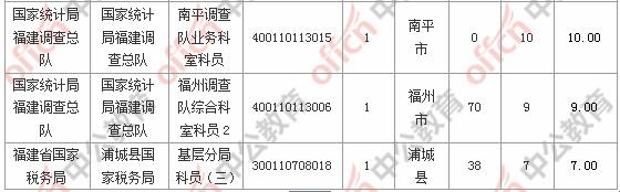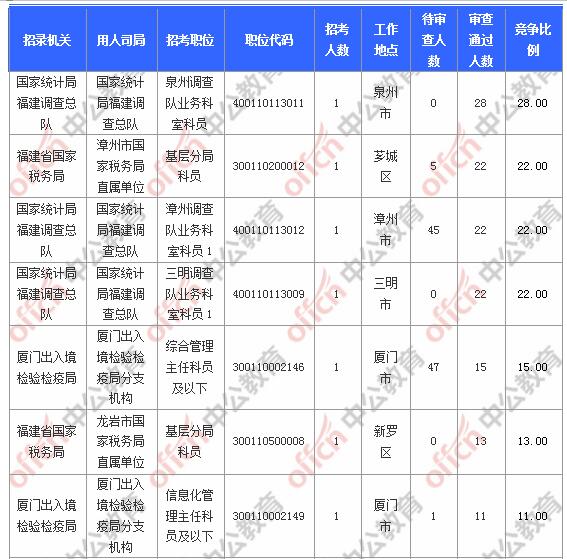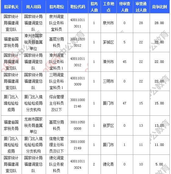 報名通過審核人數(shù)前十的職位主要集中在國家統(tǒng)計局福建調(diào)查總隊、福建省國家稅務局、廈門出入境檢驗檢疫局等部門,具體信息如下: