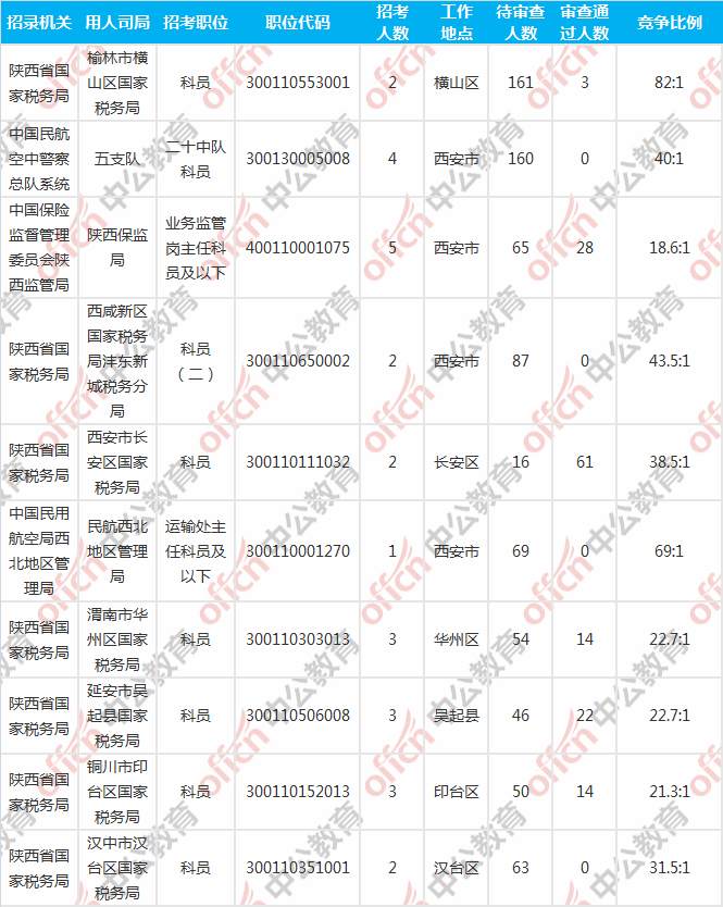 報(bào)名人數(shù)前十的職位主要集中在陜西省國家稅務(wù)局、中國民航空中警察總隊(duì)系統(tǒng)、中國保險(xiǎn)監(jiān)督管理委員會(huì)陜西監(jiān)管局等部門,具體信息如下: